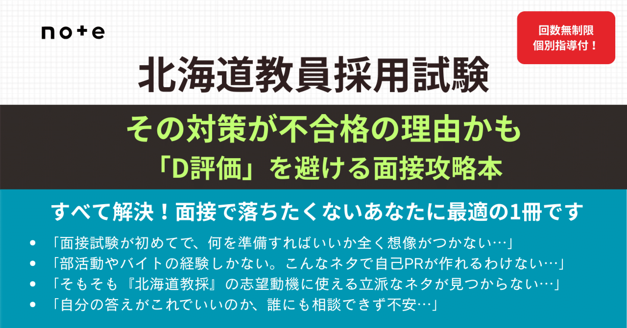 本サイトを運営し、noteフォロワー約3,000人(業界トップクラス)を誇る僕(福永)が執筆したnote、【回数無制限の個別指導】その対策、逆効果かも?北海道教採で「D評価」を避ける面接攻略本のご案内です。