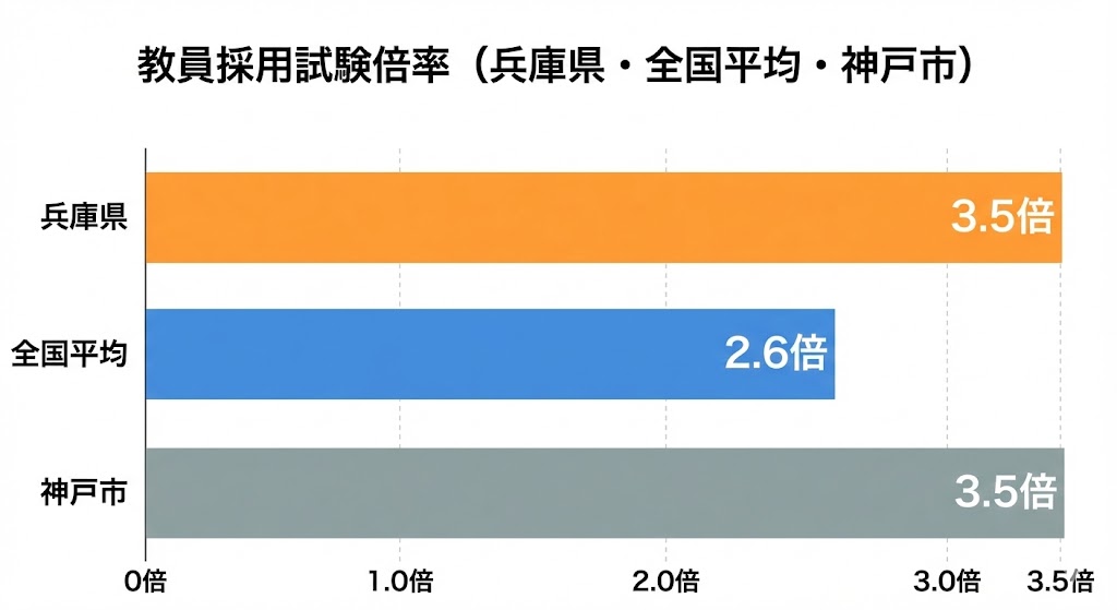 令和8年度(2025年実施)神戸市教員採用試験の平均倍率は3.5倍でした。校種によっては9倍を超える難関となっており、決して安易な試験ではありません。