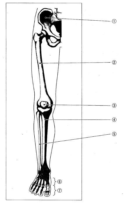 (1) 次の図は、下肢の骨を表したものである。①~⑦の名称を漢字で書きなさい。