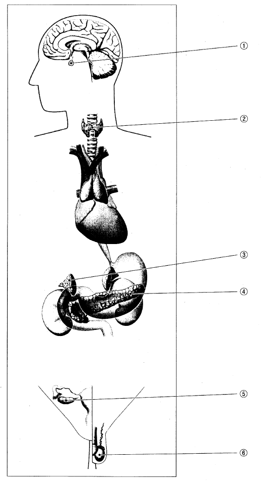 (2) 次の図は、内分泌腺及び内分泌器官の位置を表したものである。①~⑥の名称を漢字で書きなさい。